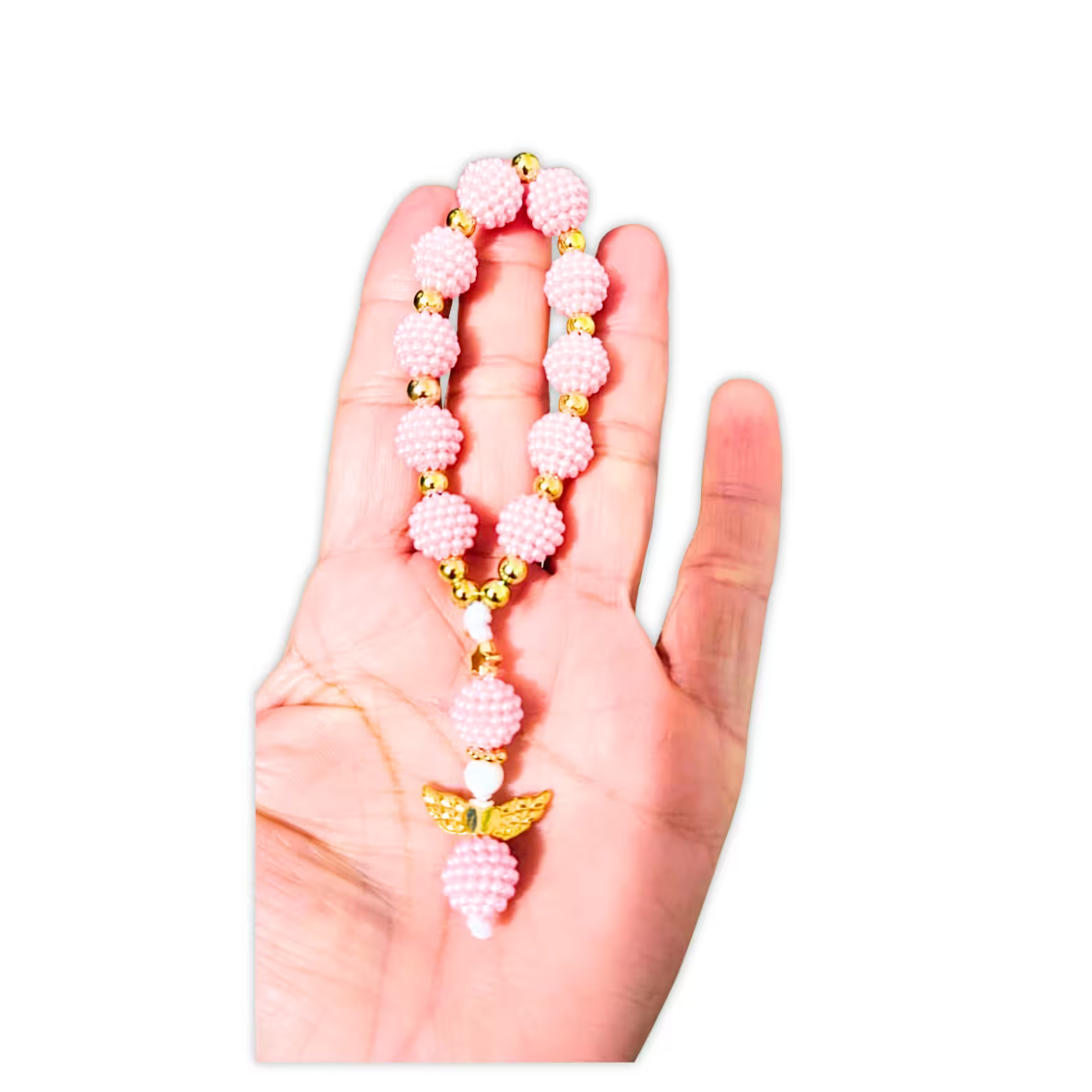 Denario con cuentas rosadas de cristal de murano, bordado en hilo terlenca con nudo franciscano, alas doradas y cuentas perladas, medalla recamada y cruz dorada, todo en acero inoxidable.