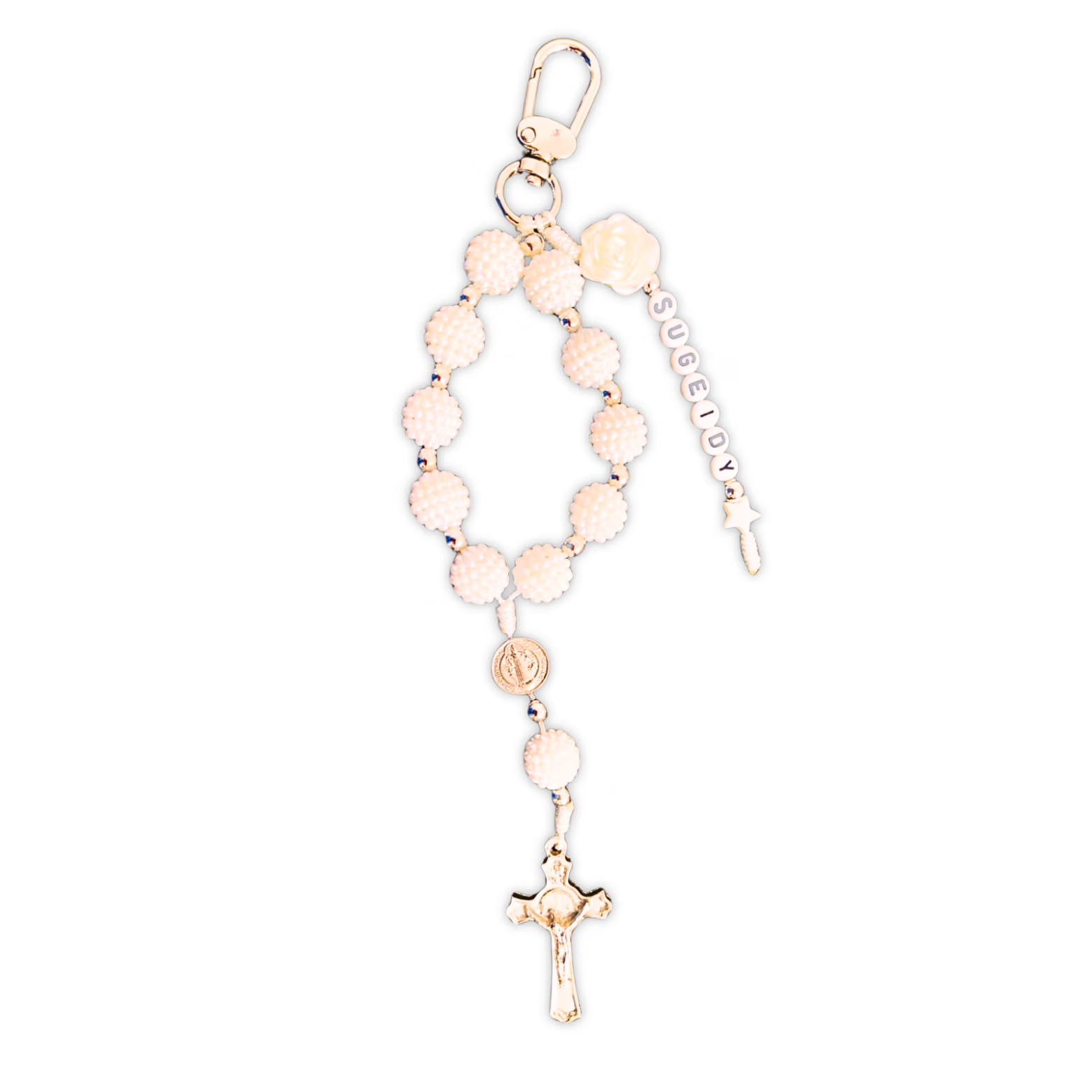 Llavero con cuentas perladas de cristal de murano, bordado en hilo terlenca con nudo franciscano, medalla de San Benito y crucifijo metálico con dije de flor, todo en material de aleación.