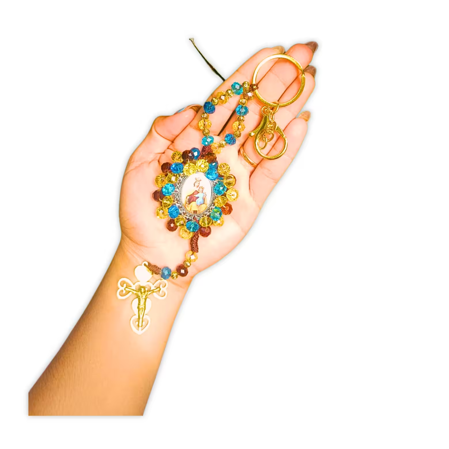 Llavero artesanal con cuentas de cristal azules y doradas de cristal de murano, bordado en hilo terlenca con nudo franciscano, medalla de la Virgen del Carmen recamada por todo su alrededor y crucifijo dorado, todo en acero inoxidable.