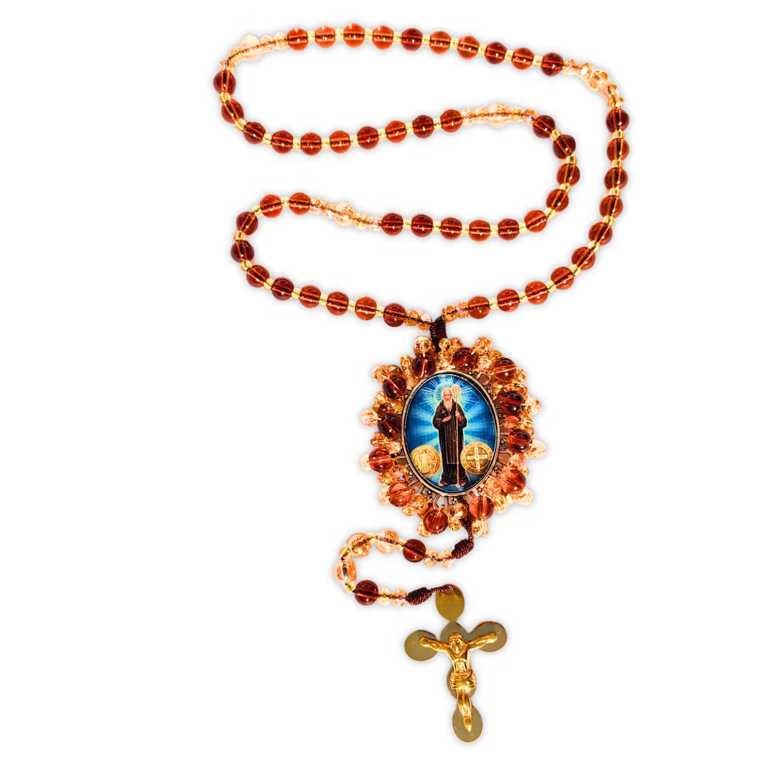 Rosario con cuentas ámbar de ojo de gato, bordado en hilo terlenca con nudo franciscano, medalla de San Benito recamada por todo su alrededor y crucifijo dorado, todo en acero inoxidable.
