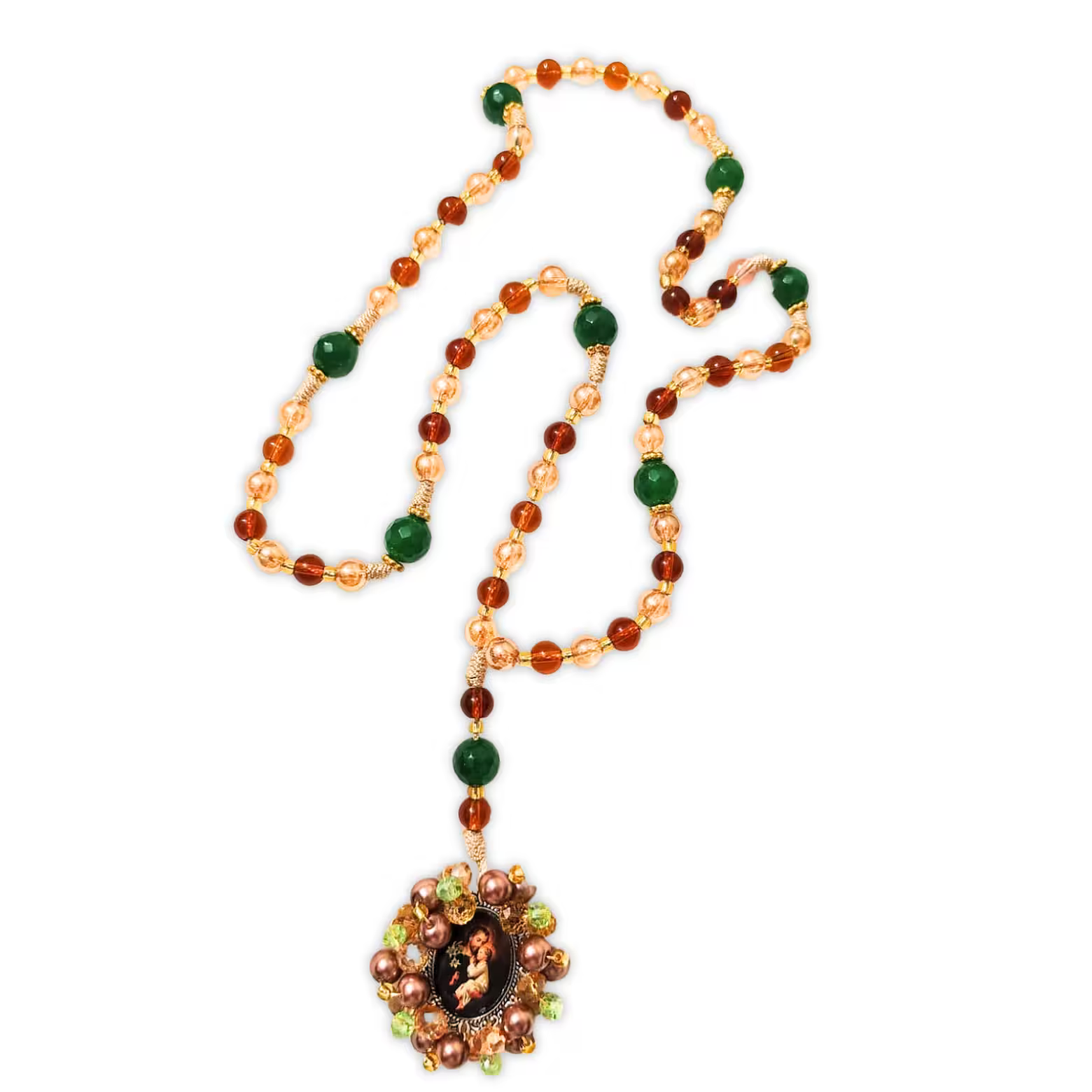 Rosario con cuentas beige claro y marrones de ojo de gato, bordado en hilo terlenca con nudo franciscano, con piedras verdes naturales, medalla de San José recamada por todo su alrededor.