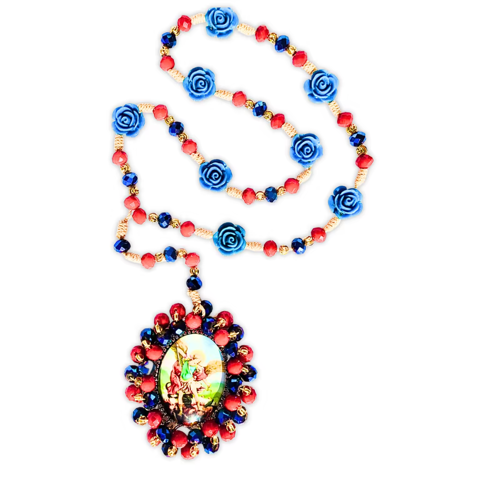 Rosario con cuentas rojas y azules de cristal de murano, bordado en hilo terlenca con nudo franciscano, adornado con flores celestes, medalla de San Miguel Arcángel recamada por todo su alrededor y cruz dorada, todo en acero inoxidable.