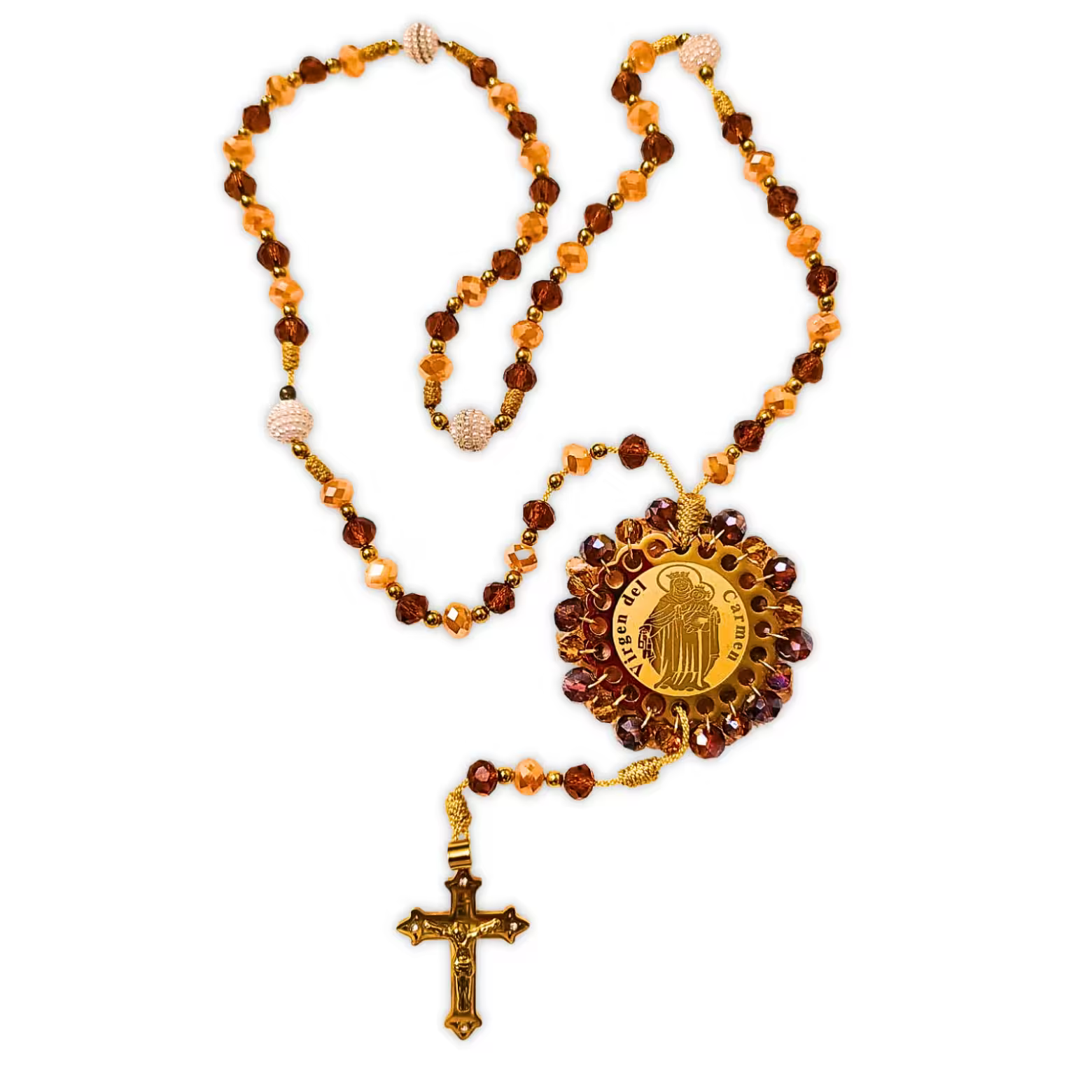 Rosario con cuentas en tonos ámbar de cristal de murano, bordado en hilo terlenca con nudo franciscano, medalla de la Virgen del Carmen recamada por todo su alrededor y cruz dorada, todo en acero inoxidable.