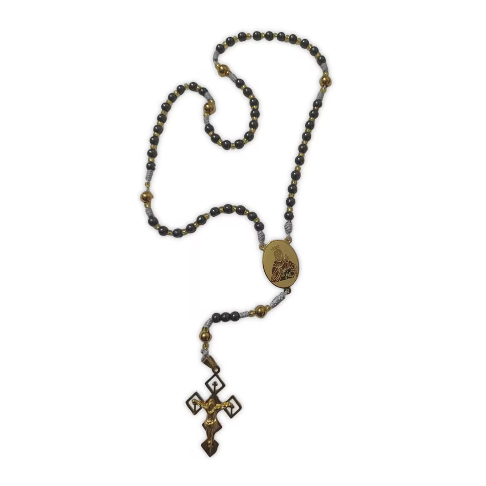 Rosario con cuentas metálicas negras y doradas de cristal de murano, bordado en hilo terlenca con nudo franciscano, medalla de la Virgen del Carmen recamada por todo su alrededor y cruz dorada, todo en acero inoxidable.